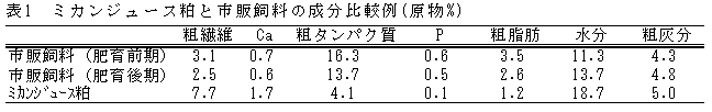 ミカンジュース粕の成分組成は一般配合飼料と比較すると繊維、カルシウムが多く、粗タンパク質、リンが少ない(表1)。