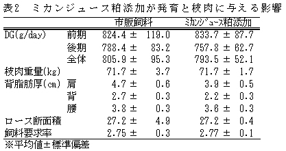 表2 ミカンジュース粕添加が発育と枝肉に与える影響