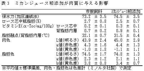 肥育前期において市販肥育飼料に外付けでミカンジュース粕を15%、塩酸L-リジンを0.1%、フィターゼ0.1%、肥育後期において市販肥育飼料に外付けでミカンジュース粕を15%、フィターゼ0.1%添加した飼料を給与することで発育、枝肉成績において市販飼料と比較して有意差が認められない(表2、表3)。