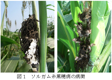 糸黒穂病は茎、穂、及び茎鞘に発生し、始めは白い膜に覆われているが、破れると黒色糸状の菌糸体が露出し、胞子が飛散する(図1)。発生した個体は、生育が劣る(図2)。