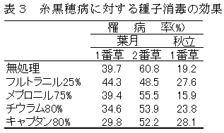 フルトラニル25%種子重量の1%、メプロニル75%種子重量の0.4%、チウラム80%種子重量の1%、キャプタン80%種子重量の0.4%の種子粉依による種子消毒は、糸黒穂病に対する効果を示さない(表3)。