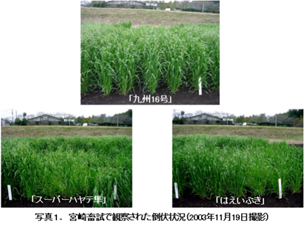 倒伏程度は「はえいぶき」や「スーパーハヤテ隼」より小さく、耐倒伏性に優れ、地域によってその傾向が顕著である(表1、図1、写真1、写真2)。