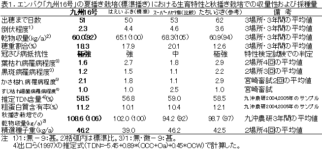 - エンバク「九州16号」は、耐倒伏性と冠さび病抵抗性が改良された品種である。既存品種よりも耐倒伏性に優れ、降雨による倒伏に強い。