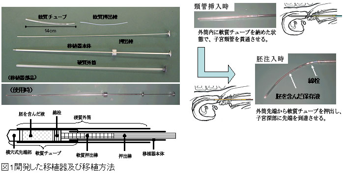 開発した移植器(深部移植器)は、金属製の移植器本体の先端に約14cmの柔軟なチューブ(横穴式の先端部を接合)を接続し、これを硬質外筒で覆う形状であり、また押出し棒の先端部には柔軟な棒を連結できる。移植方法は、先ずストロー管内の胚を含んだ液を綿栓と共に軟質チューブ内に装填し、その軟質チューブを移植器本体に接続する。これを硬質外筒内に収納した状態で子宮頸管を貫通させ、子宮角に挿入後硬質外筒から先端の軟質チューブを突出させ、子宮角深部に挿入し、押出し棒により胚を注入する。(図1)。