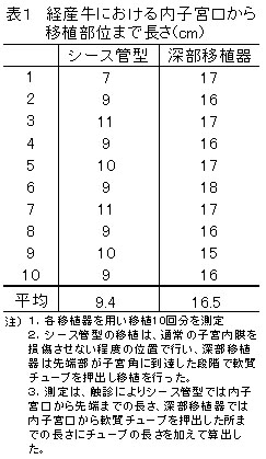 表1 経産牛における内子宮口から移植部位までの長さ(cm) |