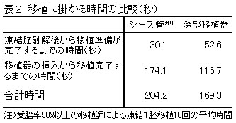 深部移植器は、ストロー管から胚を軟質チューブに装填するため、胚の移植準備が完了するまでの時間はシース管型に比べると約20秒長く掛かるが、移植器の陰部への挿入から移植完了するまでの時間は逆にシース管型に比べ約1分短縮できる。(表2)。