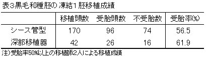 黒毛和種凍結1胚移植における受胎率は、61.9%と良好である(表3)。