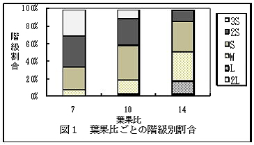 1樹当たりの収量は葉果比7で72kg、10で60kg、14で36kgとなったが、葉果比10の階級割合(%)でSが40%と最も多くなり、2SからMが86%を占め、商品性の高い果実になる(表3、図1)。