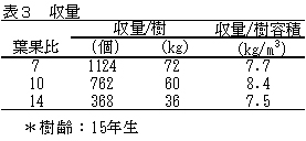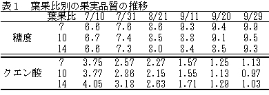葉果比が小さい(着果の負担が大きい)ほど糖が高くなるがクエン酸も高くなる傾向にある。葉果比10にすると糖度9.5、クエン酸0.97%となり最も高品質果実が生産される(表1)。