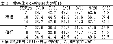 摘果後より果実の肥大に差を生じ、9月下旬の収穫時には葉果比7で2S、10でS、14でMサイズ中心となる(表2)。