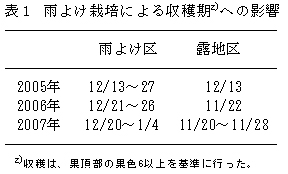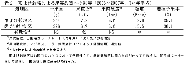 表2 雨よけ栽培による果実品質への影響(2005〜2007年、3ヶ年平均)