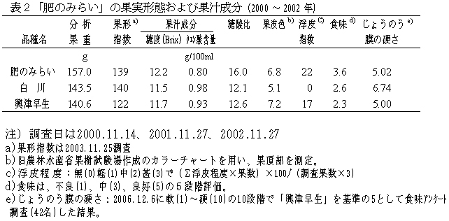 表2 「肥のみらい」の果実形態および果汁成分(2000〜2002年)