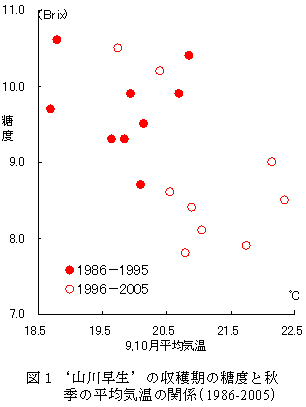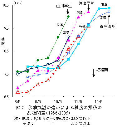 図2 秋季気温の違いによる糖度の推移の品種間差(1986-2005)