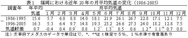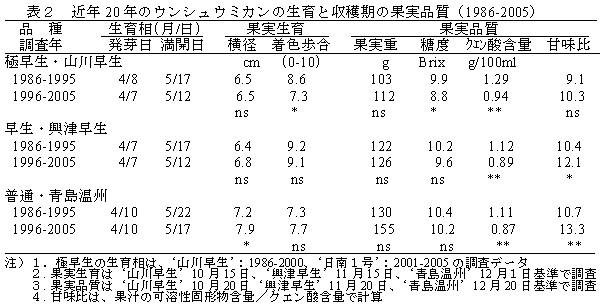 表2 近年20年のウンシュウミカンの生育と収穫期の果実品質(1986-2005)