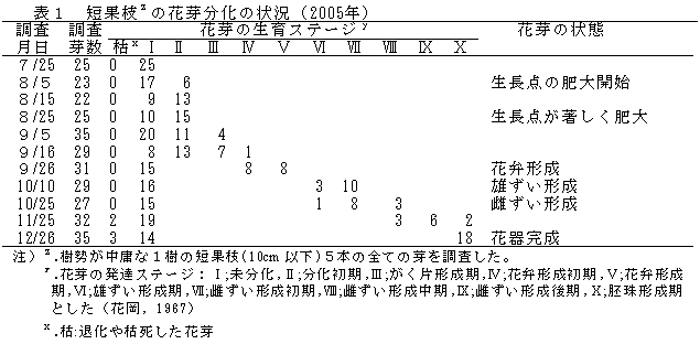 短果枝の花芽分化は8月上旬から始まり、9月上旬以降は急速に進む。12月には花器が完成する。花芽分化の開始時期は、中果枝、長果枝よりも短果枝が10日程度早い(表1、中・長果枝データは省略)。