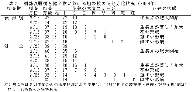 樹勢が衰弱した樹では花芽分化が健全樹よりもやや遅れ、9月下旬から枯死する花芽が認められた(表2)。