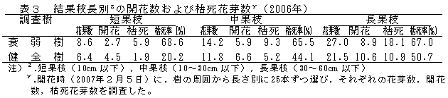 開花までに枯死する花芽は、健全樹では短果枝よりも中果枝、長果枝で多い。一方、樹勢衰弱樹では、結果枝の長さに無関係に多い(表3)。