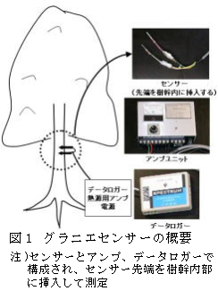 グラニエ法は、センサーから発する熱量が樹液流によって変化することを利用して測定する方法である。樹体内に長さ20mmのセンサーを挿入するため、幹径が4cm以上必要である。また、測定時に測定部への日射による温度変化や結露、雨滴等による測定誤差を防ぐため、センサー部にカバーを取り付ける必要がある。