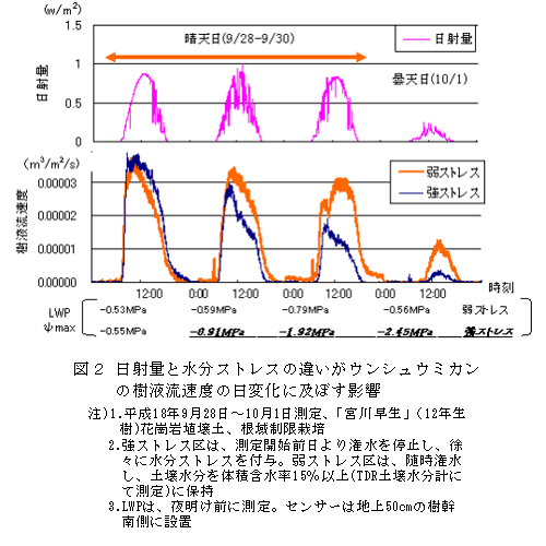 ウンシュウミカンの樹液流速度は、グラニエ法によって連続的に測定でき、日射量と強い関係があるとともに、水分ストレスが強い(LWPψmaxが低い)ほど抑制される(図2、一部データ略)。