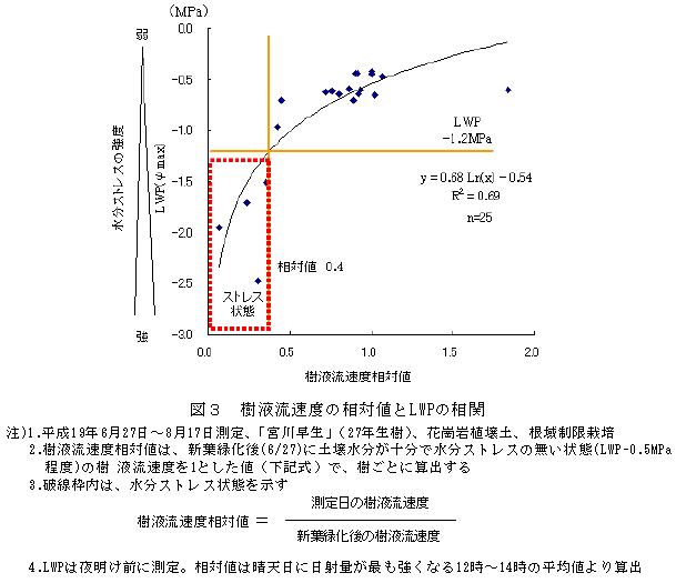 新葉緑化後(6月下旬)の樹液流速度に対する相対値が0.4以下の日は、LWPψmaxが品質向上の目安とされる-1.0MPaより低い-1.2MPa以下であり、ウンシュウミカンの樹体が潅水を必要とする強度の水分ストレス状態にあることを検知できる(図3)。