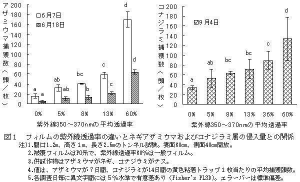 - 近紫外線除去フィルムの害虫抑制効果は、フィルムの紫外線透過率が8%以上では0%に比べて劣るが、5%以下では0%と同等に優れる。厚さ0.1mmの近紫外線除去フィルムは種類によって持続効果が異なり、2.5年間展張しても紫外線透過率が5%以下の資材がある。