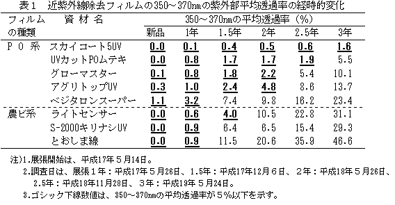 供試した厚さ0.1mmの近紫外線除去フィルムの紫外線透過率は、展張後1年経過時ではほとんど変化がないが、1.5年経過時より上昇し始め、2〜3年間の展張で紫外線除去効果の資材間差が大きくなる(表1)。