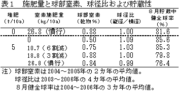 表1 施肥量と球部窒素、球径比および貯蔵性