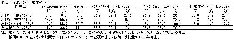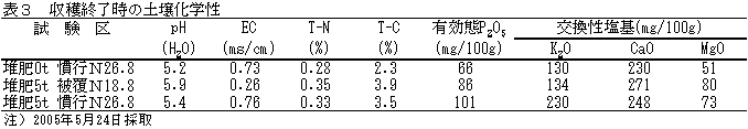堆肥5t/10aと、リン酸、カリを無施用として被覆尿素を用いることで、窒素、リン酸、カリの推定施肥量(堆肥の化学肥料養分相当量+肥料の施肥量)は、県基準の堆肥3t/10a施用の慣行施肥と同程度になり(表2)、収穫終了時の土壌中の有効態リン酸と交換性カリは堆肥無施用慣行施肥と同程度になる(表3)。