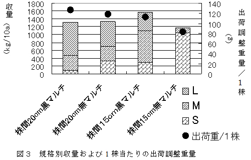 チンゲンサイの黒ポリマルチ栽培の株間は、多収でM級が中心の15cmより、商品性の高いL級の生産が多い20cmが適する。(図3)。