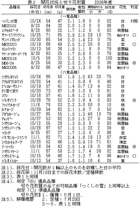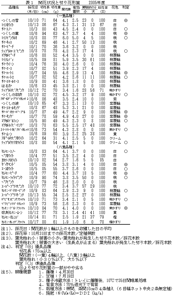 切り花品質に優れ、10月出荷に適する品種として、11品種(2005年度8品種、2006年度3品種)「つくしの雪」「つくしの薫」「サマーハート1」「サマーバイカラーパープル」「サマーキング」「ダイヤモンド」「セレモニーピーチ」「セレモニーブルーフラッシュ」「M06-24」「パレオピンク」「アートマリン」を優良品種とし、16品種(2005年度13品種、2006年度3品種)をそれに次ぐ準優良品種として選定した(表1、表2)。
