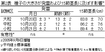 表2 種子の大きさが発蕾および15節茎長に及ぼす影響z
