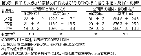 表3 種子の大きさが定植60日後およびその後の摘心後の生長に及ぼす影響z