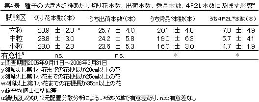 表4 種子の大きさが株あたり切り花本数、出荷本数、秀品本数、4P2L本数に及ぼす影響z