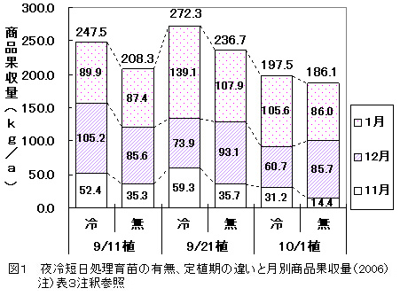 図1 夜冷短日処理育苗の有無、定植期の違いと月別商品果収量(2006)