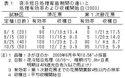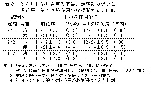 表3 夜冷短日処理育苗の有無、定植期の違いと頂花房、第1次腋花房の収穫開始期(2006)