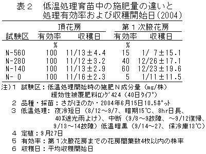 表2 低温処理育苗中の施肥量の違いと処理有効率および収穫開始日(2004)