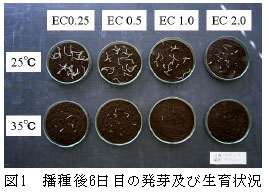 25℃恒温・暗黒条件下で土壌EC0.25dS/m〜2.0dS/mの範囲では播種後6日目の発芽率はほぼ100%であるが(表1)、土壌ECが高くなるほど発芽直後の生育は不良である(図1)。
