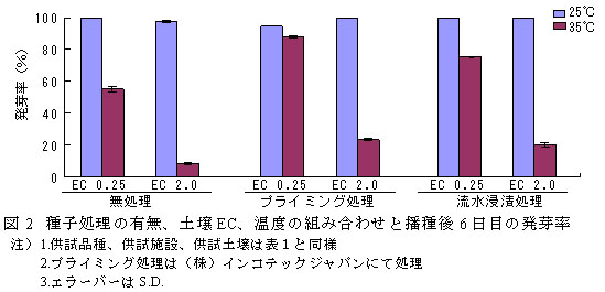 - そこで、高温条件下における発芽を左右する要因のうち、種子周辺の温度及び土壌EC、播種前種子処理の有無と発芽率の関係について検討する。
