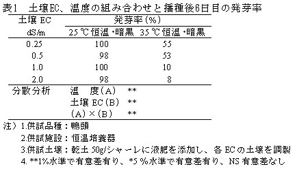 35℃恒温・暗黒条件下における播種後6日目の発芽率は土壌ECが0.25〜0.5dS/mの範囲では約50%、土壌EC1.0dS/m以上になると10%以下に低下する(表1)。
