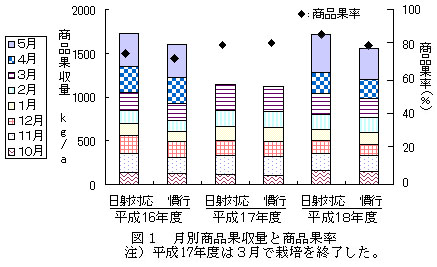 日射対応管理の商品果収量、商品果率は、慣行管理と同等である(図1)。
