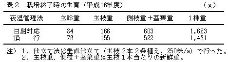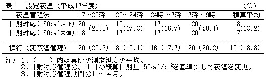- この試験における日射量に応じた変夜温管理とは、1日の積算日射量150cal/cm2を基準として、その値を下回る曇雨天日に17〜24時(前夜半)の温度を慣行に比べて2℃程度下げる管理方法である(表1)。