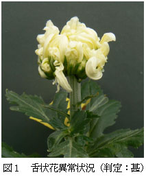 舌状花異常の「甚」判定は、出荷不能な状況であり(図1)、「中〜軽・無」判定は出荷可能である。