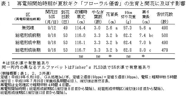 表1 再電照開始時期が夏秋ギク「フローラル優香」の生育と開花に及ぼす影響