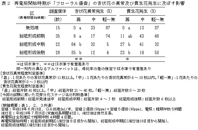 舌状花異常の発生は再電照開始時期によって異なり、総苞形成前期からでは軽微であるが、総苞形成中期および後期からでは著しく増加する(表2)。