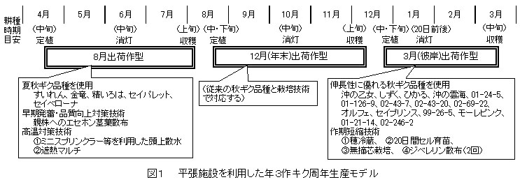 平張施設を利用した8月出荷と12月(年末)出荷、3月(彼岸)出荷作型の年3作によるキクの周年生産モデルを作成した(図1)。