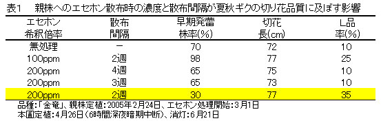表1 親株へのエセホン散布時の濃度と散布間隔が夏秋ギクの切り花品質に及ぼす影響