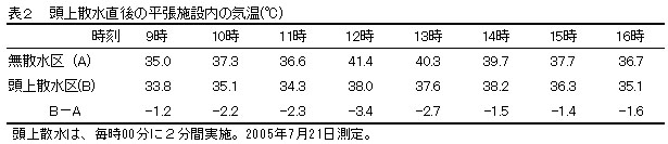 頭上散水は、日中1時間おき2分間を目安とする。散水で葉表面が白くなる場合は、収穫時に葉の洗滌が必要である。