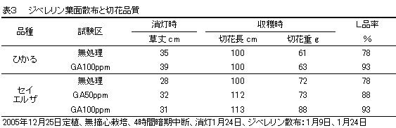 12月(年末)出荷後、3月(彼岸)出荷を可能にする品種は、伸長性に優れる秋ギク「沖の乙女」外14品種である(図1)。2週間の穂冷蔵、20日間のセル育苗、無摘心栽培、消灯前の100ppmジベレリン2回散布(表3)により伸長性が向上し、作期が短縮する。