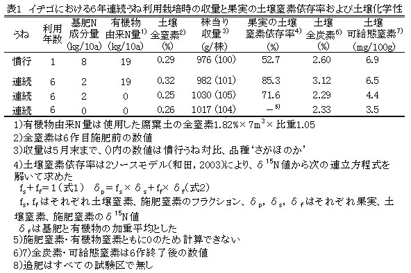 - 基肥量の少ないイチゴの連続うね利用栽培では、果実の全窒素δ15N値は土壌の全窒素δ15N値を反映している。土壌窒素依存率は72〜85%と推定され、慣行の53%に比べて高い。6作連続うね利用しても収量は低下しないが、有機物を施用しないと土壌窒素が消耗する。