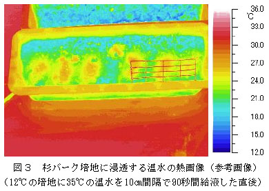培地内の水分動態は、培地と温度差の大きい水を所定の条件で給水し、培地内の温度分布を赤外線熱画像装置で撮影すると容易に把握できる(図3)。